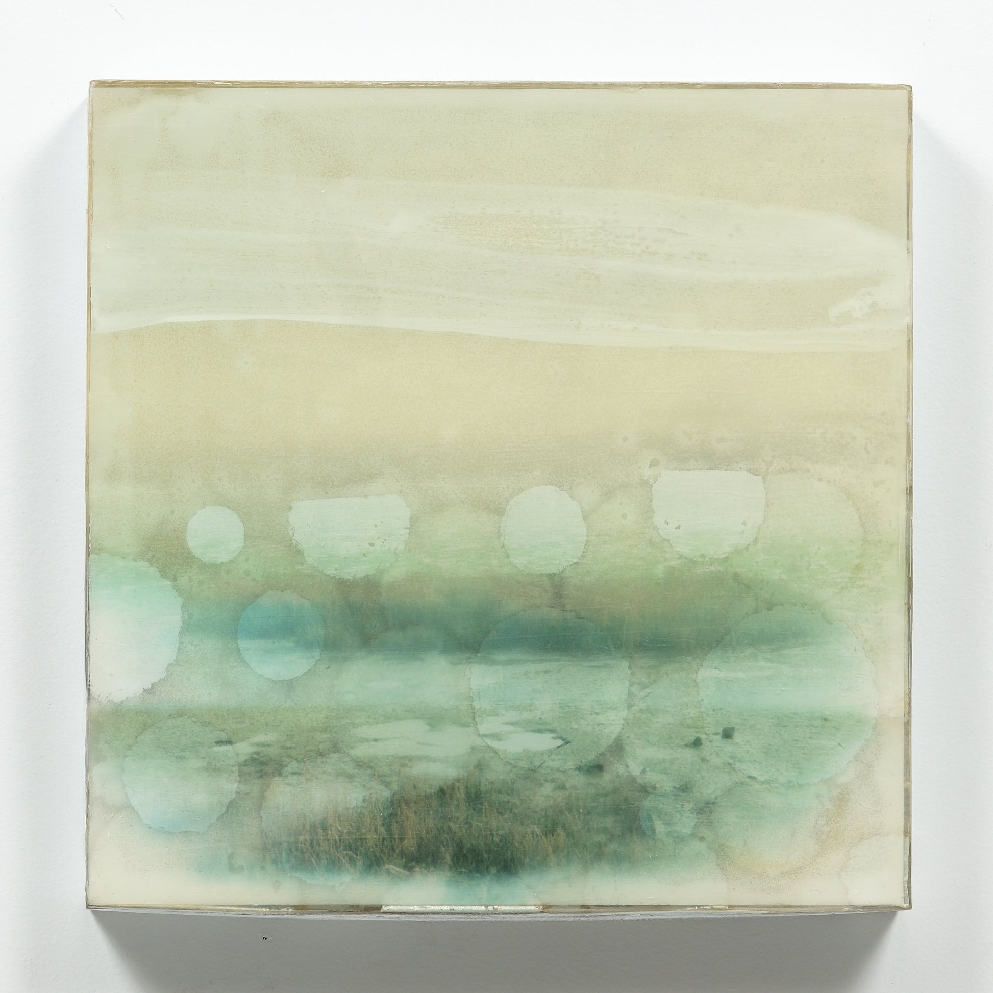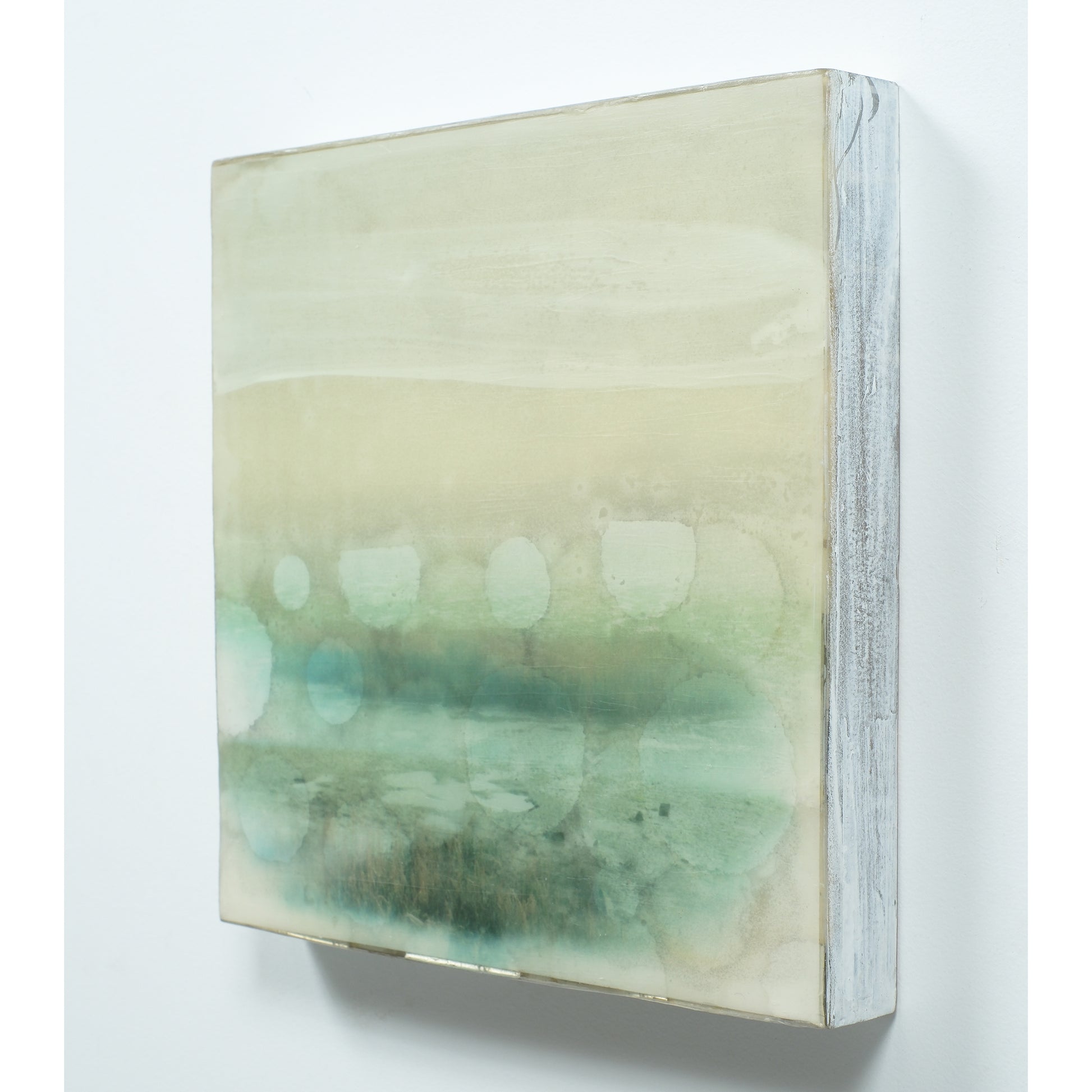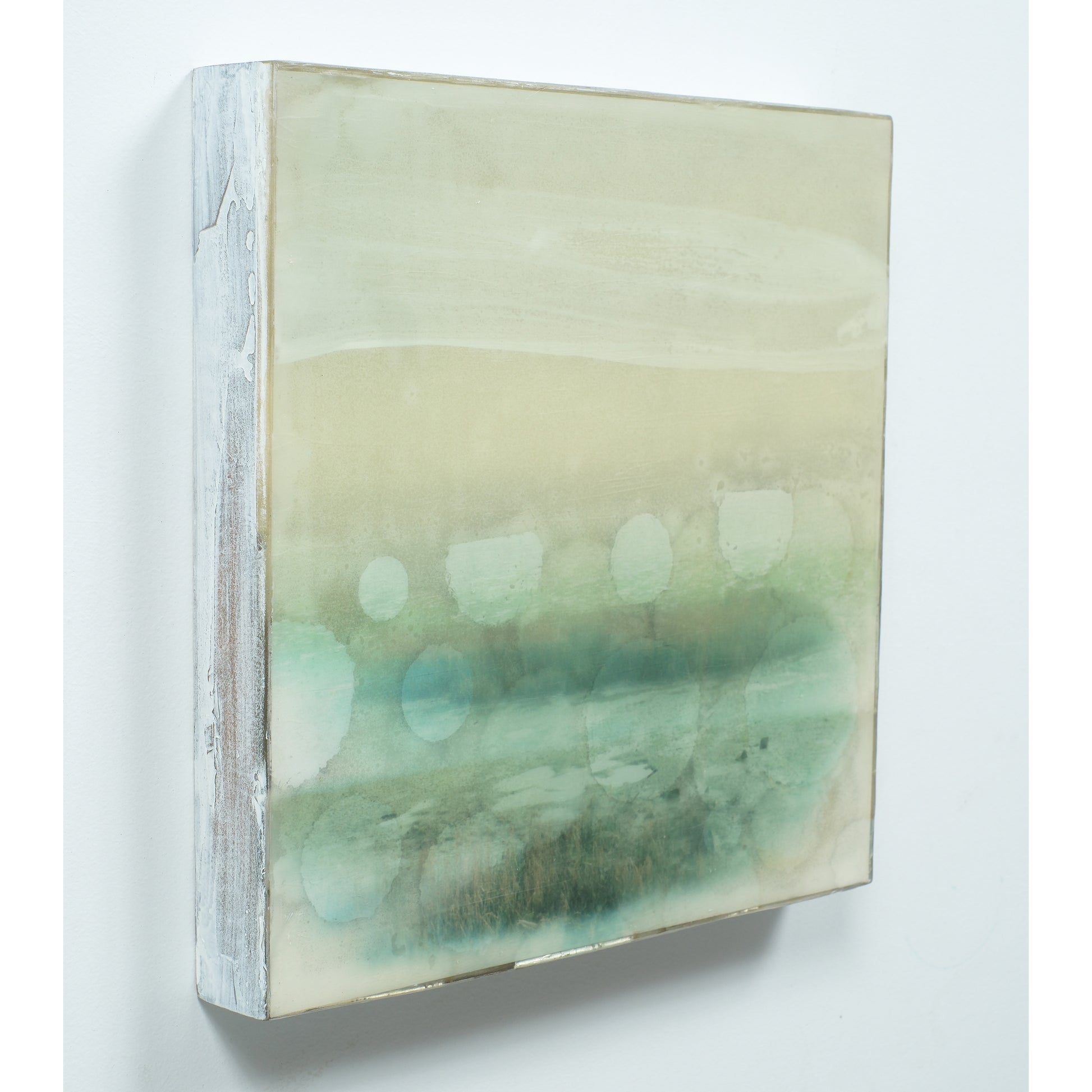Accent colours are blues, greens and warm earth tones with silver leaf circles. The piece is sealed with resin and finished with cold wax to give it a matte finish. Created in 2023.