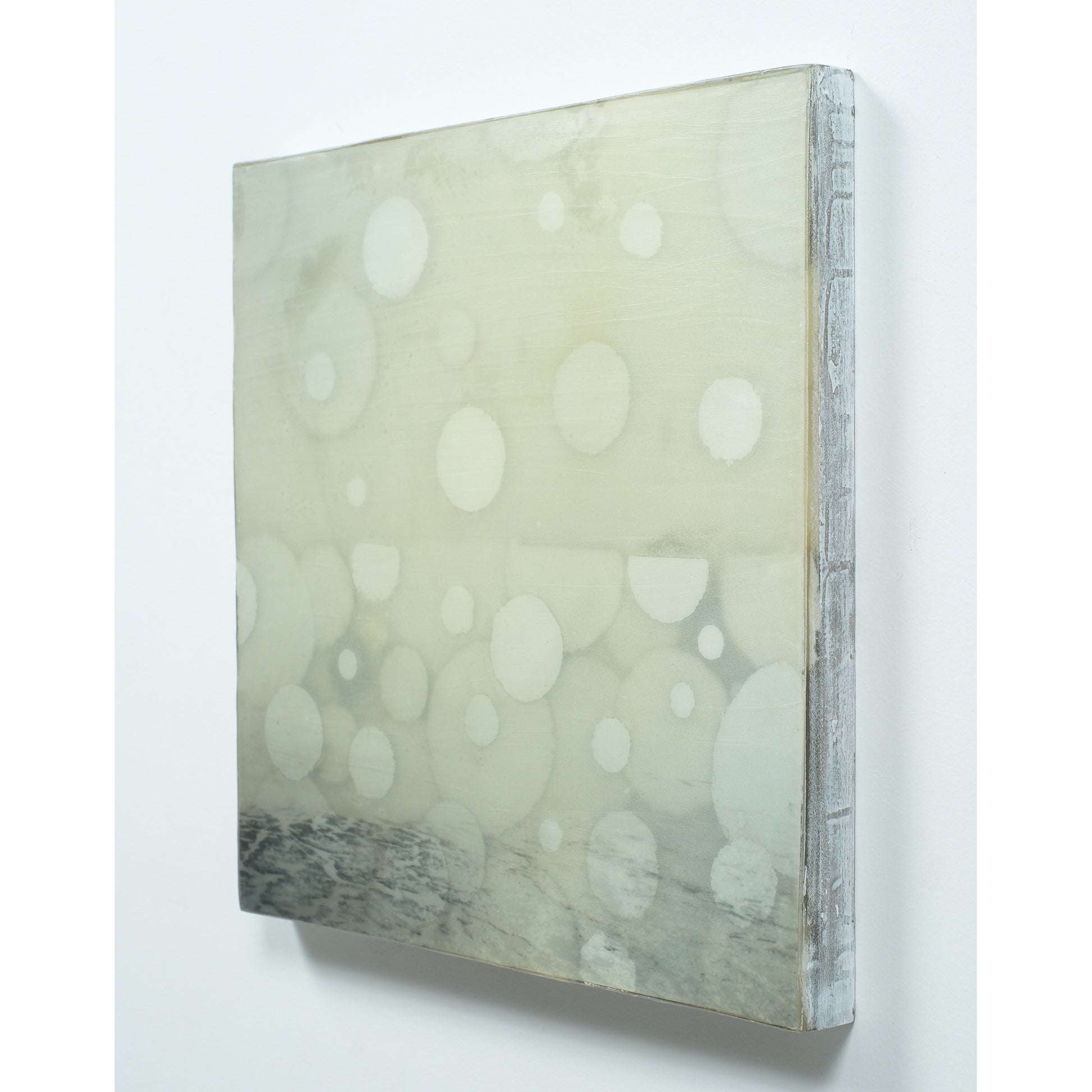 Accent colours are blues and grey with silver leaf circles. The piece is sealed with resin and finished with cold wax to give it a matte finish. Created in 2023.