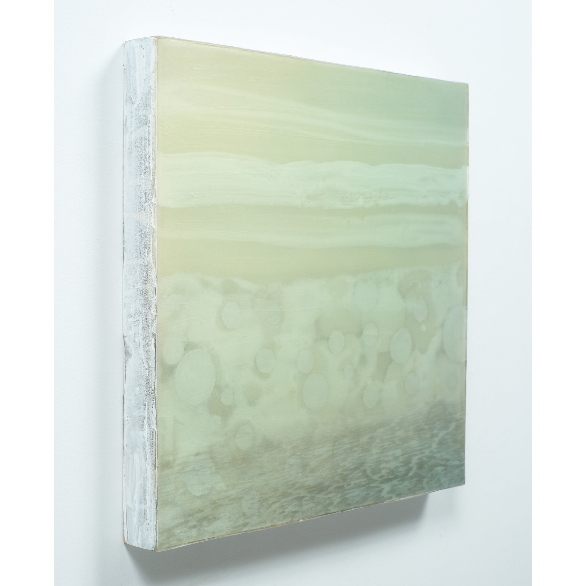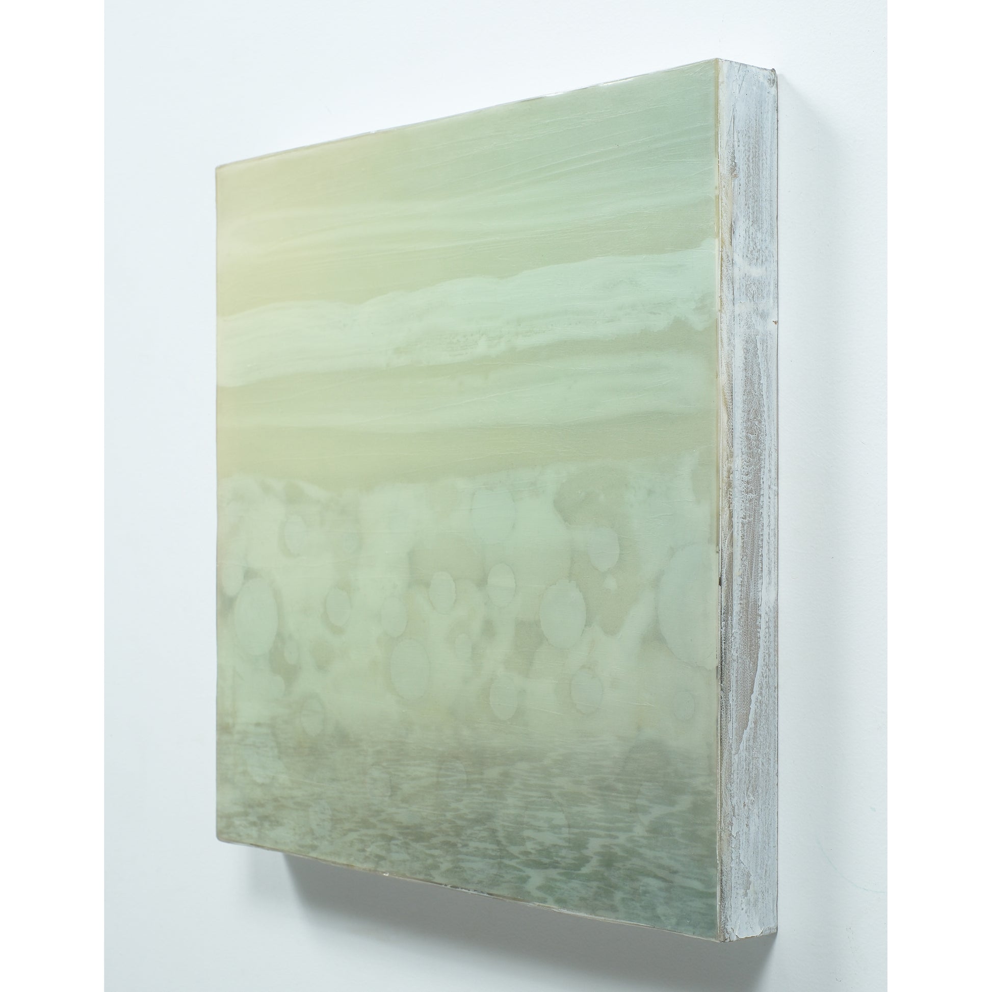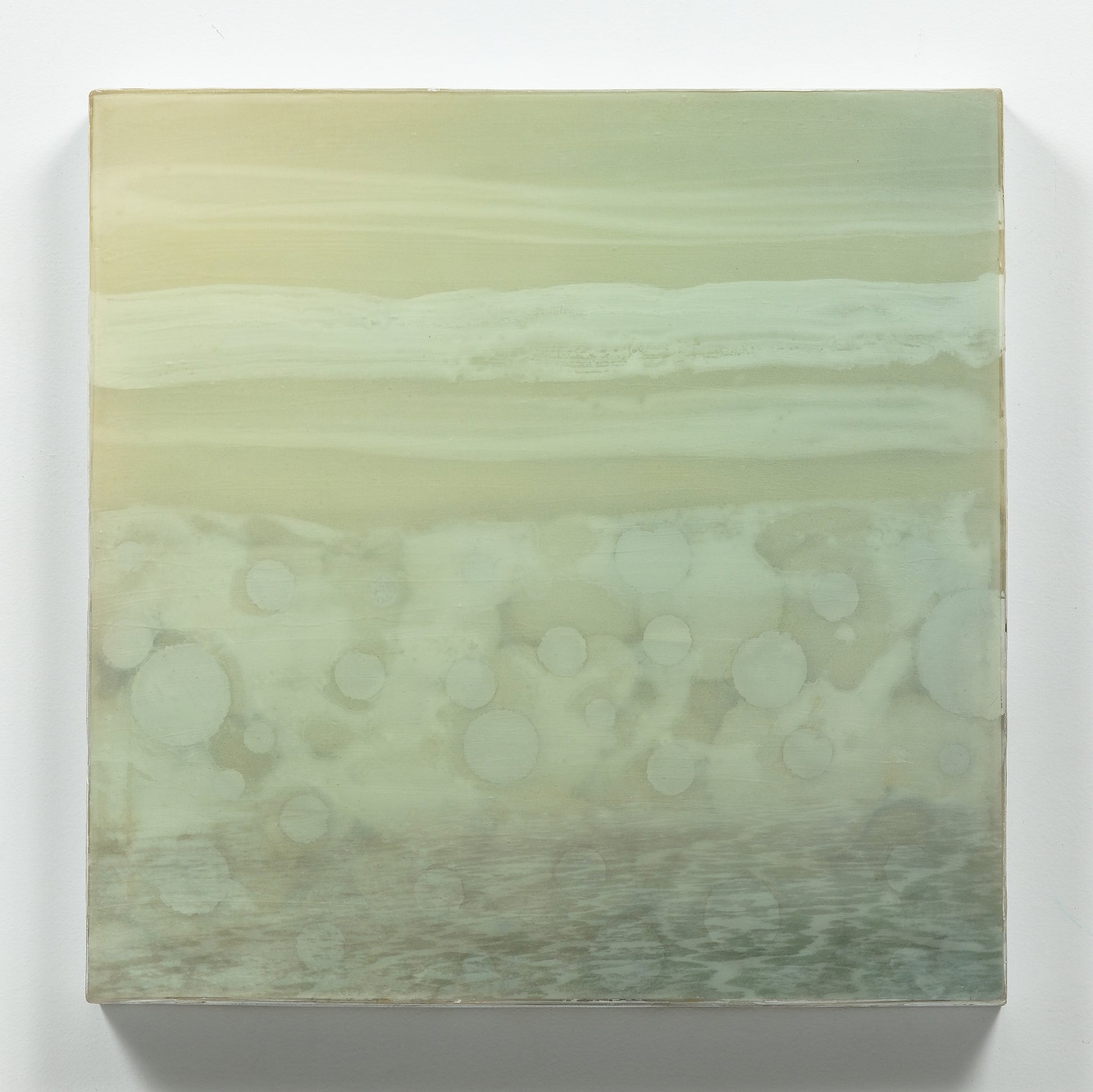 Accent colours blues, greens and vintage yellow hues with silver leaf circles. The piece is sealed with resin and finished with cold wax to give it a matte finish. Created in 2023.