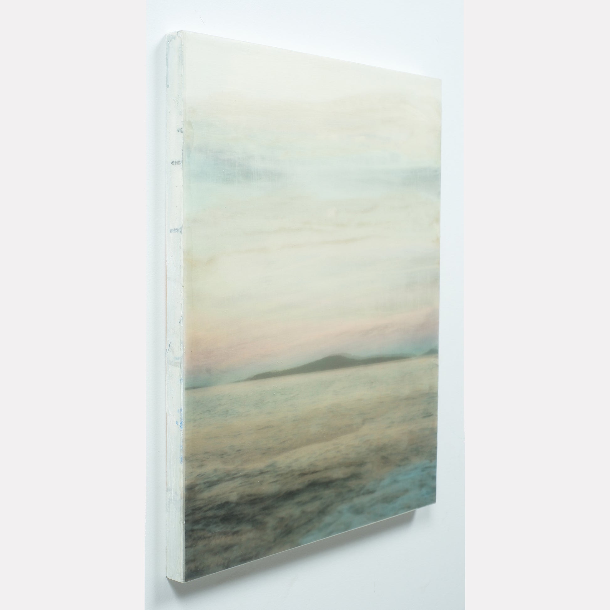 The surface is sealed with a clear, cold wax that gives the piece a soft, matte finish. This technique adds a subtle texture and quiet depth to the work.